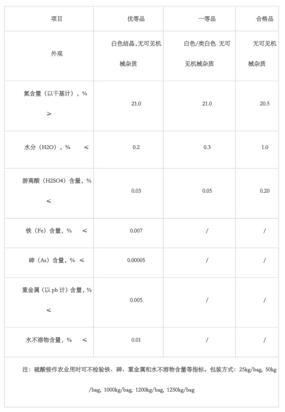 优等品:氮含量-≥21%;水分-≤0.2%;游离酸-≤0.03%;铁含量-≤0.007%;砷含量-≤0.00005%;重金属-≤0.005%;水不溶物-≤0.01%。